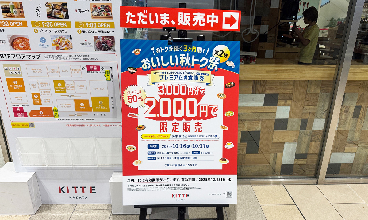 KITTE博多様のプレミアムお食事券販売事業にて、運営計画の策定、マニュアル作成、販促POP等のデザイン、スタッフキャスティング、当日の運営実施までをトータルで担当いたしました。