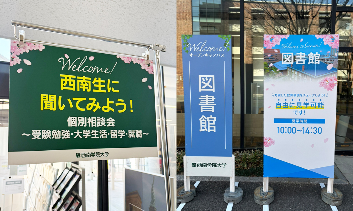 福岡市の大学 西南学院大学で春のオープンキャンパスを開催した。キャンパスを彩るべく、且つ参加者が分かりやすい動線案内ができるように看板・サインを制作し設置・撤去までを行いました。